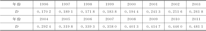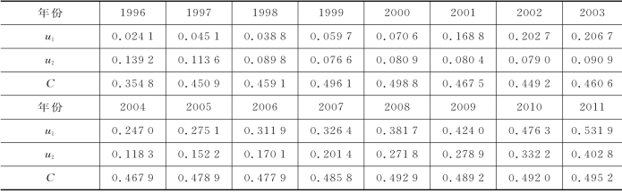 表4-5 1996—2011年海陆经济子系统耦合度值