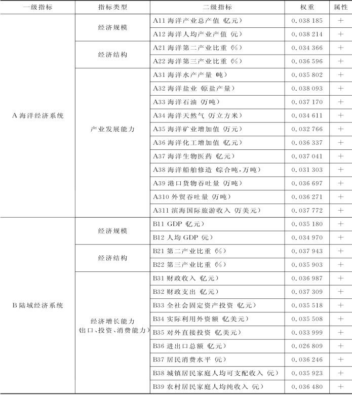 A海洋经济系统中,经济规模指标涵盖A11海洋产业总产值(亿元)、A12海洋人均产业产值(元)两个二级指标;经济结构指标,涵盖A21海洋第二产业比重(%)、A22海洋第三产业比重(%)两个二级指标;产业发展能力指标,涵盖A31海洋水产产量(吨)、A32海洋盐业(原盐产量)、A33海洋石油(万吨)、A34海洋天然气(万立方米)、A35海洋矿业增加值(万元)、A36海洋化工增加值(亿元)、A37海洋生物医药(亿元)、A38海洋船舶修造(综合吨,万吨)、A39港口货物吞吐量(万吨)、A310外贸吞吐量(万吨)、A311滨海国际旅游收入(万美元)11个二级指标。