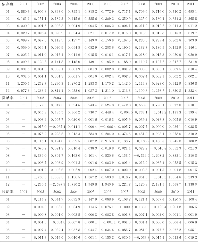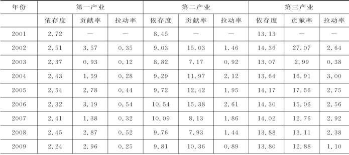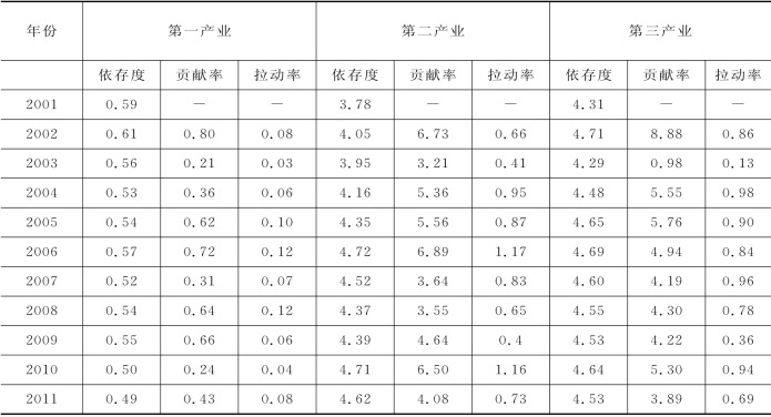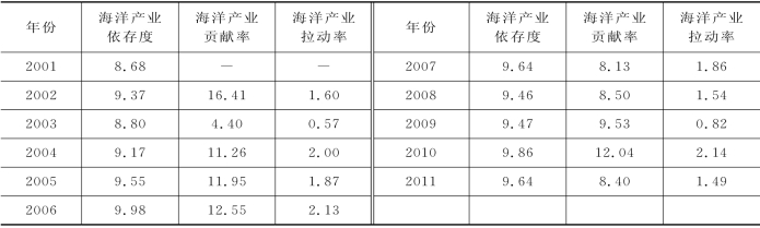 从表4-8中可以看出,海洋产业的依存度不断提高,从2001年的8.68%提升到2011年的9.64%,最大值达到9.86%(2010年);从产业贡献率来看,海洋经济的发展对我国经济增长贡献较为明显,2002年达到了16.41%,2002—2006年间,年均贡献率在10%以上,2007—2011年间,虽然贡献率有所下降,但仍稳定在8%以上;从产业拉动率来看,除了2003年和2009年,海洋经济对我国经济增长的拉动率基本在1.5%以上,是我国经济增长的有力支点。