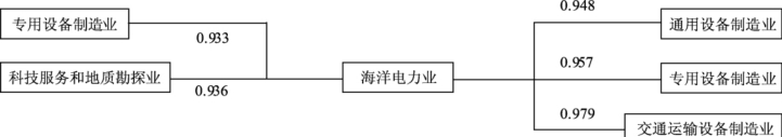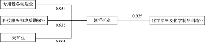 海洋矿业与其前向关联产业采矿业、专用设备制造业、科技服务和地质勘探业,以及后向关联产业化学原料及化学制品制造业都有较强的关联,相关度均在0.9以上(图4-15),表明其行业在海洋产业中的基础地位。