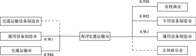 海洋交通运输业,其前向关联产业主要包括通用设备制造业、交通运输设备制造业、交通运输业等,但当前与交通运输设备制造业的关联度较低,其后向关联产业包括农牧渔业、专用设备制造业、通用设备制造业、文体娱乐业等(图4-22),但与文体娱乐业关联度不高。