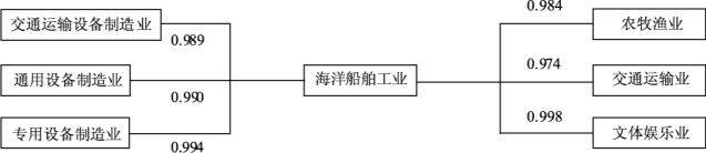 海洋船舶工业,与其上游产业交通运输设备制造业、通用设备制造业、专用设备制造业以及其下游产业农牧渔业、交通运输业和文体娱乐业都呈现较强的关联,其关联产业多,涉及面广,对海陆产业发展有重要的支撑作用(图4-17)。