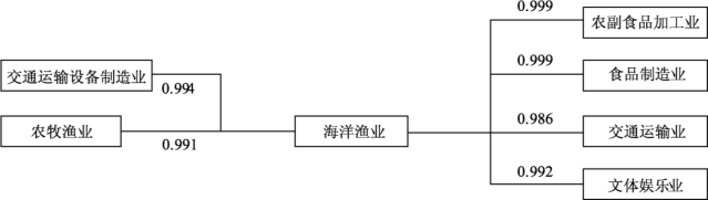 海洋渔业与其前向关联产业农牧渔业和交通运输设备制造业,以及后向关联产业农副食品加工业、食品制造业、交通运输业、文体娱乐业都有较强的关联性,大部分产业与海洋渔业间的相关度都在0.99以上。这和海洋渔业在海洋产业中的地位以及渔业在第一产业中的重要地位息息相关。