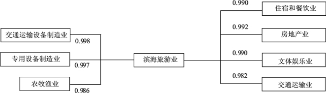 滨海旅游业也是与其他关联较多的海洋产业,其前向关联产业主要包括专用设备制造业、交通运输设备制造业、农牧渔业等,其后向关联产业主要包括住宿和餐饮业、房地产业、文体娱乐业、交通运输业等(图4-23),对经济发展的带动作用较强。