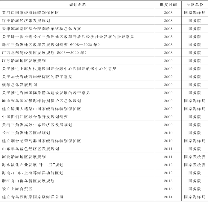总体来看,在“十二五”期间国家“面向海洋”的大背景下,相关的政策、制度也陆续出台。自2009年以来,国务院批复了涉及海洋和沿海区域发展的一系列规划举措(表5-1),标志着新一轮沿海大开发、大开放时代的再次到来,也标志着各沿海地区发展规划已经上升为国家战略层面的区域发展规划。新的沿海区域规划体系,构成了我国海陆区域经济新的版图。