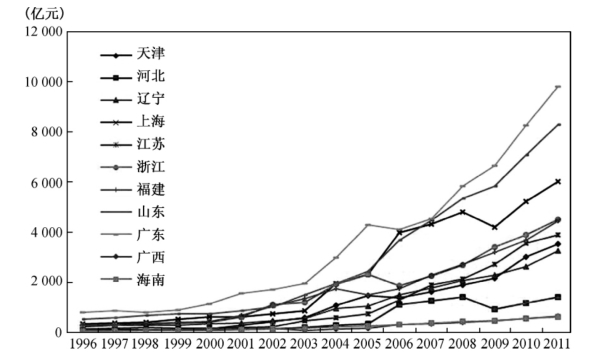 图5-2 1996—2011年沿海各省市区历年海洋GDP