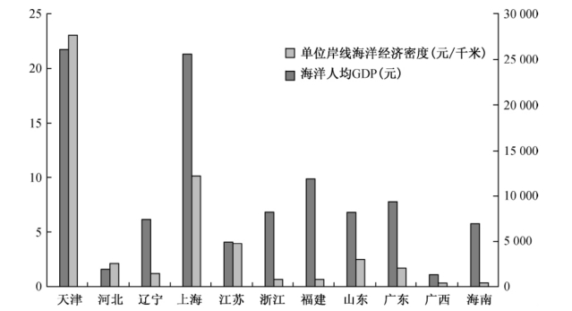 图5-3 2011年沿海各省市区海洋人均GDP及单位岸线海洋经济密度