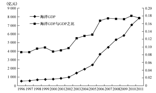海洋经济在山东省经济结构中具有重要地位,发展水平较高,增长速度亦较快,海洋GDP从1996年的513.74亿元,到2003年突破千亿元,“十一五”以来,其增速进一步加快,2011年达到7 892.9亿元,比2010年增长17.2%,在沿海省市区中位居第二,仅次于广东。海洋GDP占全省的比重也不断增加,从20世纪90年代末、21世纪初的不到10%,到2011年比重达到17.3%,大大高于全国平均水平。在海洋产业中,海洋渔业、滨海旅游业、海洋化工产业在海洋经济中占主导地位。2011年,其海洋渔业产出2 388.2亿元,较2010年增长16.7%;滨海旅游业产出1 917.1亿元,较2010年增长19.1%;海洋化工业产出663.3亿元,较前一年增长17.4%[6]。