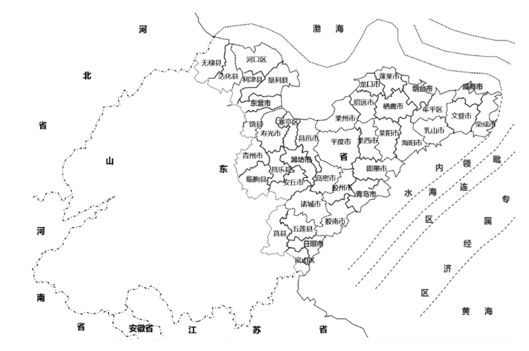 山东省位于黄河下游,属于中国东部沿海地区。全省下辖17个地级市,140个县(市、区),陆地总面积15.71万km2,近海域面积约17万km2,包括威海、烟台、东营、滨州、潍坊、青岛、日照7个沿海城市,济南、德州、淄博、泰安、莱芜、聊城、济宁、枣庄、菏泽、临沂10个内陆城市。2011年,山东省总人口9 417.23万人,全省GDP45 429.2亿元,比2010年增长10.9%[4],是我国经济较为发达的省份。