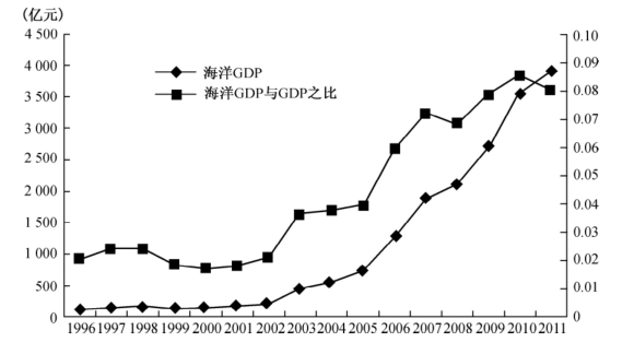 图5-8 1996—2011年江苏省海洋GDP及海洋GDP与GDP之比
