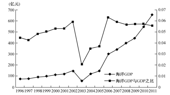 图5-16 1996—2011年广西壮族自治区海洋GDP及海洋GDP与GDP之比