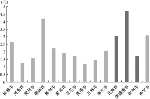 图5-17 广西壮族自治区各市人均GDP比较(深色柱为沿海城市)