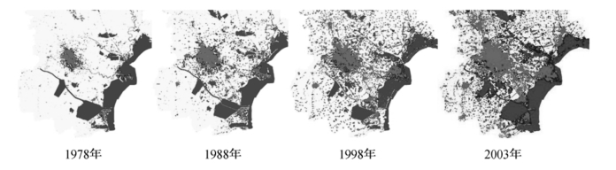 从这一时期的空间格局来看,由单核心向双核心,由内陆向海洋发展已经成为主要趋势。天津1978年总体格局还属于单核心,中心城区建成区面积远远大于周边城区;到了1988年,滨海地区,尤其是塘沽地区建成区面积开始扩张,中心城区—塘沽双核结构已初现端倪;到了1998年,中心城区和滨海新区建成区面积都进一步扩展,中心城区—塘沽“双核”结构的空间格局已十分明显,两区之间也开始通过交通轴线慢慢连接,此外,滨海的汉沽和大港两区沿着海岸带一线建成区面积也开始增加,向沿海一带的扩张越来越明显;到2003年,中心城区和塘沽一带建成区面积继续增加,两区之间也通过交通网络的联系而渐渐趋于融合,滨海一带由最初独立的三个组团,沿着海岸带开始慢慢整合,滨海发展的空间格局渐渐形成。