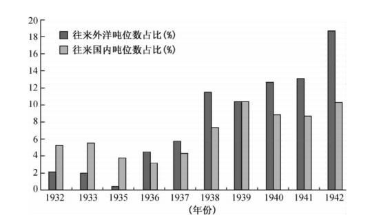 这一时期,在外部力量的干预下,天津港口的再次迁移以及经济结构的转变,迫使其发展的方向又一次转向海洋,虽然其港口位置仍然在海河下游的内陆地区,但其主要职能是通过海洋运输发展对外贸易,成为沟通海外与内陆地区的媒介,由封闭内向的漕运主导内贸经济形势,转变为开放外向的以海港为主导的外贸经济模式。从天津开埠以来至抗日战争爆发前,天津海关进出口贸易量逐年上升,进出口额分别从1868年的115.1万两、79.6万两,增加到1928年的11 263.4万两、8 199.6万两(图6-4);往来外国船舶吨位数占全国比重从1932年的2.14%,上升到1942年的18.77%;往来国内船舶吨位数占全国比重从1932年的5.14%,上升到1942年的10.39%,至20世纪20年代,逐渐成为仅次于上海的全国第二大通商口岸(图6-5)。