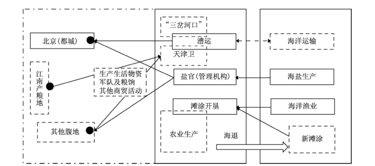 期间,除了元朝及明初有过一段时期的河—海联运外,其空间联系基本依赖南北大运河的漕运体系,漕运成为主导,而漕运的节点——海洋的意义随着海陆位置的变迁(军粮城一带由于海退成为新的陆地)以及海路被漕运取代,同时其作为辽东物资转运的节点作用也渐渐淡化,作为“天子渡口”的意义更加强化,被纳入以北京为核心的交通运输体系当中。