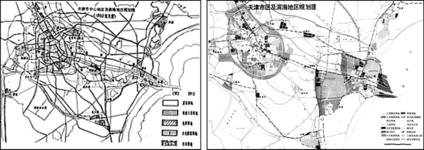 1960年的《天津城市规划初步方案》说明中,提出了将天津由原先的“单一城市”改为“组合型城市。”这一轮规划为天津将来城市发展方向向沿海地区转移奠定了基础。但20世纪60年代至70年代,在“三线”建设的主导思想下,城市发展仍以原先的中心城区为主,沿海地区的发展仍然受到限制。