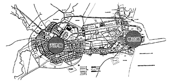 到了20世纪初,由于海河逐渐淤塞,加之远洋船舶的不断大型化,原先紫竹林港区一带已经无法满足大型船舶的海洋运输需求,大型船只不能上溯海河驶往天津,只能在塘沽一带卸货,因此这一带就逐渐成为海陆运输货物的集散地[21]。到了日本侵华时期,为了掠夺华北资源,日本于1939年开始在海河口北岸的沉积海岸上修建塘沽新港,并从区域层面考虑,制定了“天津市都市计划大纲”和“天津都市计划大纲区域内塘沽街市计划大纲”等城市规划方案[22],这一举措促进了天津从传统意义上的“河港”向现代意义上的“海港”转变,在空间形态上也发生了跨越式的演变,从原先集中于围绕租借形成的老城区范围,逐步向天津—塘沽新城的空间格局发展(图6-7),也进一步拉进了天津与海洋的关系。但实际上,塘沽的建设目标并未达到,到1945年日本投降之际,实际完工量仅为预先计划的30%,直到解放前,市内港区海运吞吐量仍占天津港海运吞吐量的70%[23]。虽然建设初衷是日本以掠夺中国内地资源为侵略服务,但天津新港的设立,也是现代天津滨海地区发展的起点,为其城市未来发展明确了定位,并为在未来进一步走向海洋奠定了基础。