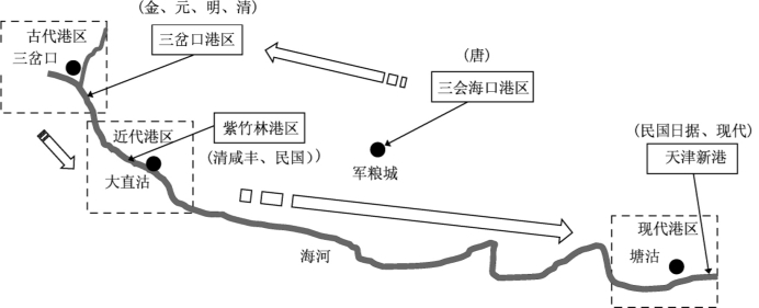 自金朝、元朝起,天津的城镇中心从原先滨海的“三会海口”,迁移到了依托内河的“三岔河口”一带,标志着其发展定位的第一次重大转变。金朝于1153年在北京建都,在运河及海口一带设“直沽寨”,是为天津市聚落起源的最早记载。直沽地扼内河及海上航运,实为军事及交通上的咽喉要枢[11]。公元1271年,元世祖忽必烈定都大都(今北京),至元二十年(公元1283年)试行海运成功,自此漕粮大规模海运[12],开始了漕—海联运的时代。元延祐三年(公元1316年),直沽寨改为海津镇,成为漕粮转运中心和军事重镇。