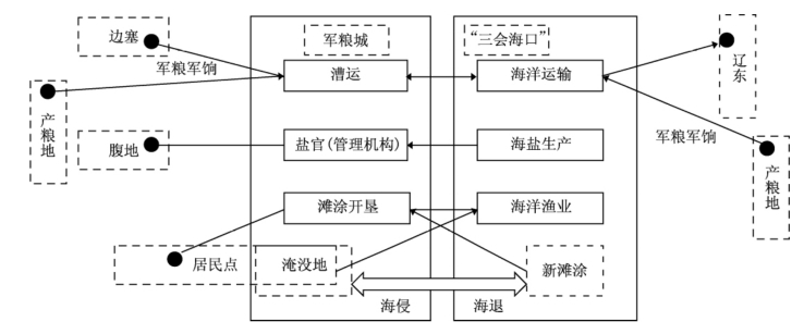 而最先促使天津地面产生城市的雏形则是其认识到海洋交通的重要性,因为北方戍边的需求,加之其河海兼备的独特地理区位,使这一地区成为海陆运输的中转站;而京杭运河的开通,在初期更加强化了其海运功能,一方面,为了加强对北方边塞地区的控制,控制从江南地区的粮饷运输,而采用了河海两路并举的方略。河运路线沿用隋代修凿的南北大运河航线,即从江南水陆运输枢纽——扬州装船启运,经通济渠、永济渠到天津东南独流(今海河南岸的泥沽),再折向西北通过永定河古道抵达幽燕;海运路线由长江口转樯沿海岸北驶绕过山东半岛西行历莱州湾、渤海湾经沧州沿岸抵三会海口北岸的刘家台(今军粮城),卸漕装仓以待转运[8]。另一方面,军粮城也成为往辽东地区通过海路输送军饷军粮集散和转运的空间节点。