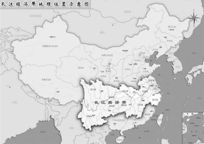 长江经济带是中国经济版图中的重要轴线,东起上海、西至云南,涉及云南、四川、贵州、重庆、湖北、湖南、江西、安徽、江苏、浙江、上海九省两直辖市(图7-2)。长江全长6 300km余,其流域提供了中国36.5%的水资源、48%的可开发水电资源、52.5%的内河通航里程,是连接中国东中西部的“黄金水道”,推动建设长江经济带,其战略意义重大而又深远:长江流域通航能力强,经济资源、人文资源丰富,打造黄金水道经济带,实现由沿海向内陆纵深发展、梯度发展是发掘、释放我国广阔腹地的重大举措。此外,长江经济带和别的经济区域最大的不同,是其把东、中、西部天然连接在一起。未来构建沿海与中西部相互支撑、良性互动的新棋局,通过改革开放和实施一批重大工程,让长三角、长江中游城市群和成渝经济区三个“板块”的产业和基础设施连接起来,要素流动起来,市场统一起来,促进产业有序转移衔接、优化升级和新型城镇集聚发展,形成直接带动超过1/5国土、约6亿人的强大发展新动力[4]。