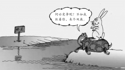 龟兔赛跑,第一次兔子在路上睡着了,乌龟得了第一名。第二次赛跑,兔子没有睡觉,一下跑到终点,兔子赢了。第三次赛跑,乌龟说要按照它指定的路线跑,兔子同意了。但是,这条路中间有一条河,兔子停下了,乌龟游过去了。自然而然,第三次乌龟赢了。第四次,龟兔合作,兔子把乌龟驮在背上跑到河边,然后乌龟又把兔子驮在背上游过河去。