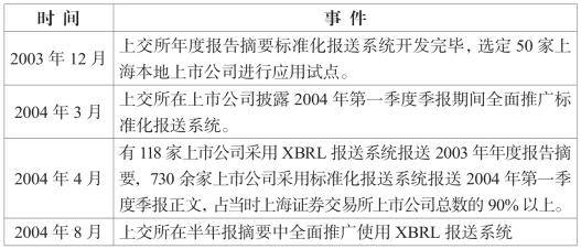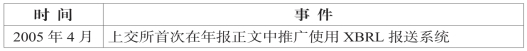 中国在XBRL方面的研究与应用均起步较早。2002年证监会开始着手制定《上市公司信息披露电子化规范》,该规范于2003年底经审批通过,XBRL的技术规范被确定采用,我国与国际接轨。2004年中国证监会成立了XBRL工作组,统一领导上海证券交易所和深圳证券交易所开展XBRL研究与实践。两个交易所分别成立XBRL工作小组,各自开发XBRL分类标准。