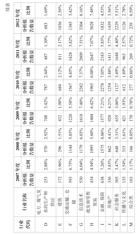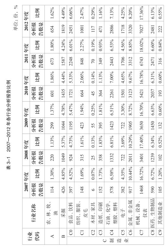 第三,分析师研究报告在行业之间也是不均匀的。如表3-1所示,制造业由于上市公司比较集中因而获得了更多分析师的关注,其中金属、非金属行业与机械、设备、仪表行业在制造业中的受关注度更高一些。另外,金融保险业、信息技术业都有比较高的分析报告覆盖率。