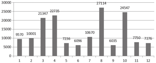 第二,就总量而言,分析师对2007—2012年度上市公司发布的研究报告共计160377份。按年度的分析如图3-4所示,研究报告数量可谓是逐年稳步增长,由2007年的8782份快速增长至2010年的32299份,再稳健增长至2012年的40468份,6年间增长了4倍多。按月度的分析如图3-5所示,研究报告在月度之间的分布是不均匀的,3月、4月、8月和10月较为集中,共计95743份,约占到了研究报告总数的60%,而这几个月刚好是一季报、年报、半年报和三季报发布比较集中的月份,因此初步验证了上市公司发布的定期报告仍然是证券分析师进行盈利预测的重要信息来源。