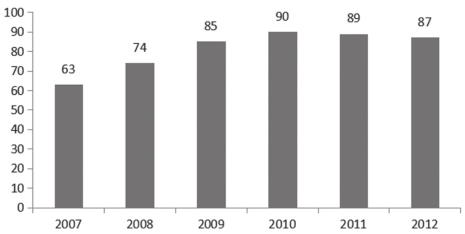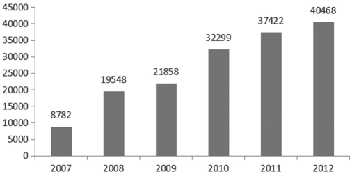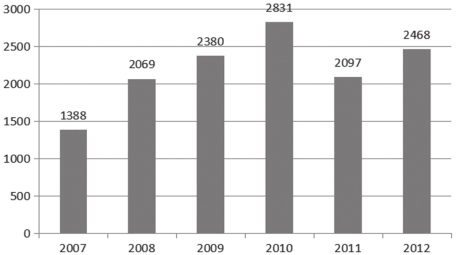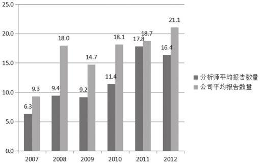 第一,得益于我国经济的平稳增长和证券市场的逐渐成熟,证券分析行业蓬勃发展,最直接地体现在发布证券研究报告的机构(图3-2)和从业分析师的数量(图3-3)上。如图3-2所示,研究机构数量由2007年的63家稳步增长至2010年的90家,2011年和2012年基本稳定在89和87家。如图3-3所示,发布研究报告的签名分析师的数量增长趋势基本与研究机构一致,2007年的分析师仅为1388名,2010年倍增至2831名,随后回落至2012年的2468名。