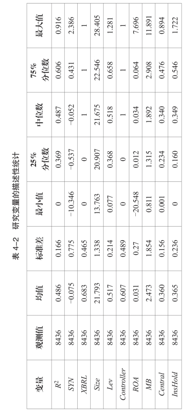 表4-2 报告了研究变量的描述性统计。样本中R2的均值和中位数分别为0.486和0.487,远高于其他绝大多数国家的R2,与李增泉、Morck et al.(2000)和Jin & Myers(2006)的研究结果基本吻合。股价同步性指标SYN由模型(2)转换得来,最小值和最大值分别为-10.346和2.386,表明样本公司间的股价同步性差异较大。产权属性指标Controller中位数为1,说明样本公司中绝大多数为国有控股公司。公司成长性指标MB的最小值和最大值分别为0.811和11.891,表明我国上市公司成长性存在较大差异。股权集中度指标Central的中位数为0.34,说明我国一股独大现象严重。机构投资者持股比例InsHold的均值为0.365,我国机构投资者近年发展较快,根据Koh(2007)的研究,美国机构投资者的持股比例约为37%。
