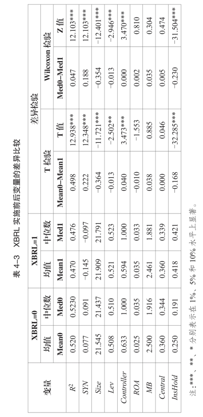 为了进一步考察XBRL财务报告实施对股价同步性的影响,本文分别检验了实施XBRL财务报告前后各变量均值差异与中位数差异。表4-3中XBRL=0表示实施XBRL财务报告之前,XBRL=1表示XBRL财务报告实施之后。如表中所示,XBRL财务报告实施前后,上市公司的股价同步性指标R2均值分别为0.520和0.470,中位数分别为0.523和0.476,均值的T检验与中位数的Wilcoxon检验均在1%的水平上显著,表明实施XBRL财务报告前后上市公司的股价同步性显著下降,支持了假设H1。当然,这只是基于均值与中位数的初步检验,在下面的回归分析中将控制其他因素的影响,实证检验XBRL财务报告的实施对股价同步性的影响。