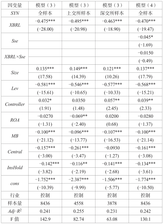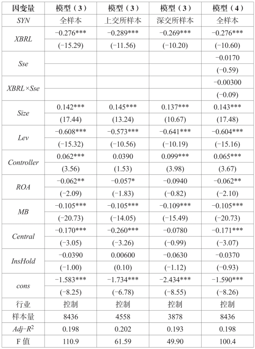 本文股价同步性指标SYN的计算是借鉴Roll(1988)、Durnev et al.(2003)的做法,其中模型(1)中的行业收益率是按照中国证监会行业分类标准的一级行业为基准,这也是国内学者比较流行的处理方法。但我国证券市场行业分布有其特殊性,比如本文中8436个公司样本有4844家公司属于制造业,占总样本的57.4%。新兴市场的股价同步性偏高,因此二级行业被同一大行业内的其他二级行业影响从而股价“被同步”的概率增大,如此一来,股价同步性指标的计算就有可能产生偏差。本文在稳健性检验1中,将模型(1)中计算行业收益率的行业基准细分至二级行业,尽量避免股价“被同步”的影响,更加准确地计算个股股价同步性指标。
