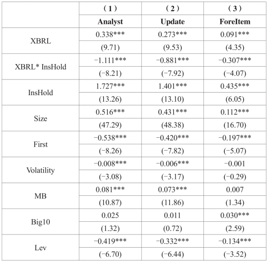 表5-8报告的是对于不同机构投资者持股比例的上市公司,实施XBRL后分析师盈余预测效率变化的情况。回归(1)~(3)中XBRL与InsHold的系数均在1%的水平上显著为正,与之前的检验结果一致。但(1)~(3)中XBRL* InsHold的系数分别为-1.111、-0.881、-0.307,并且都在1%的水平上负向显著,表明实施XBRL财务报告后,机构投资者持股比例较低的上市公司在分析师跟踪及预测效率上提升幅度更大,验证了假设H5。