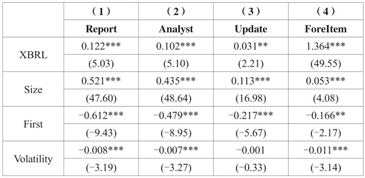 表5-7报告了模型5.1~模型5.4的多元回归结果。其中回归(1)和(2)分别检验了XBRL的实施对分析师预测次数、分析师跟踪数量的影响,XBRL的系数在(1)和(2)中分别为0.122和0.102,均在1%的水平上显著为正,表明上市公司同步披露XBRL财务报告后,有更多的分析师对其跟踪,并对公司的盈余预测发布更多的研究报告。但这种结果也可能是由分析师行业景气度提升,更多的研究人员加入分析师的行列,即分析师供给的增加导致。回归(3)和(4)则检验了实施XBRL对分析师预测效率的影响,(3)中XBRL的系数为0.031,在5%的水平上正向显著,表明采用XBRL财务报告后分析师盈余预测更新频率上升,即上市公司被分析的频率显著提升;(4)中XBRL的系数为1.364,在1%的水平上显著为正,表明XBRL实施后提高了分析师信息获取与信息分析的效率,研究报告中预测的内容即平均预测项目数显著增加。回归(1)~(4)的结果分别验证了假设H1~H4,即实施XBRL财务报告提高了分析师预测的效率。其他控制变量的回归结果与预期基本一致。