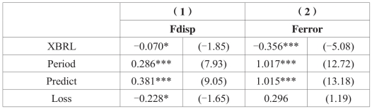 表5-9报告了上交所与深交所实施XBRL财务报告对分析师预测分歧度和准确度影响的检验结果。回归(1)中XBRL的系数为-0.070,在10%的水平上显著为负,(2)中XBRL的系数为-0.356,在1%的水平上显著为负,表明两个交易所实施XBRL,即同步披露XBRL财务报告,使得证券分析师能够对公司财务指标做更广泛和更深入的对比分析,挖掘财务信息价值,对财务报告解读地更加充分,因而分析师的预测分歧程度会降低,进而准确度提高。控制变量方面,Period(预测时长)系数均在1%水平上显著为正,表明分析师研究报告公布日越接近公司年报发布日期,其可以获取的信息量越大,对公司信息的解读与判断越准确,因而预测的分歧度越低,准确性越高。Predict(盈余可预测程度)的系数也均在1%的水平上显著为正,表明公司的盈余可预测程度越高,即非经营性损益所占比重越大,分析师对公司的盈余进行预测的难度就越大,进而关于预测的分歧程度就越高,准确性就越低。表5-9的检验结果验证了假设H6~H7。