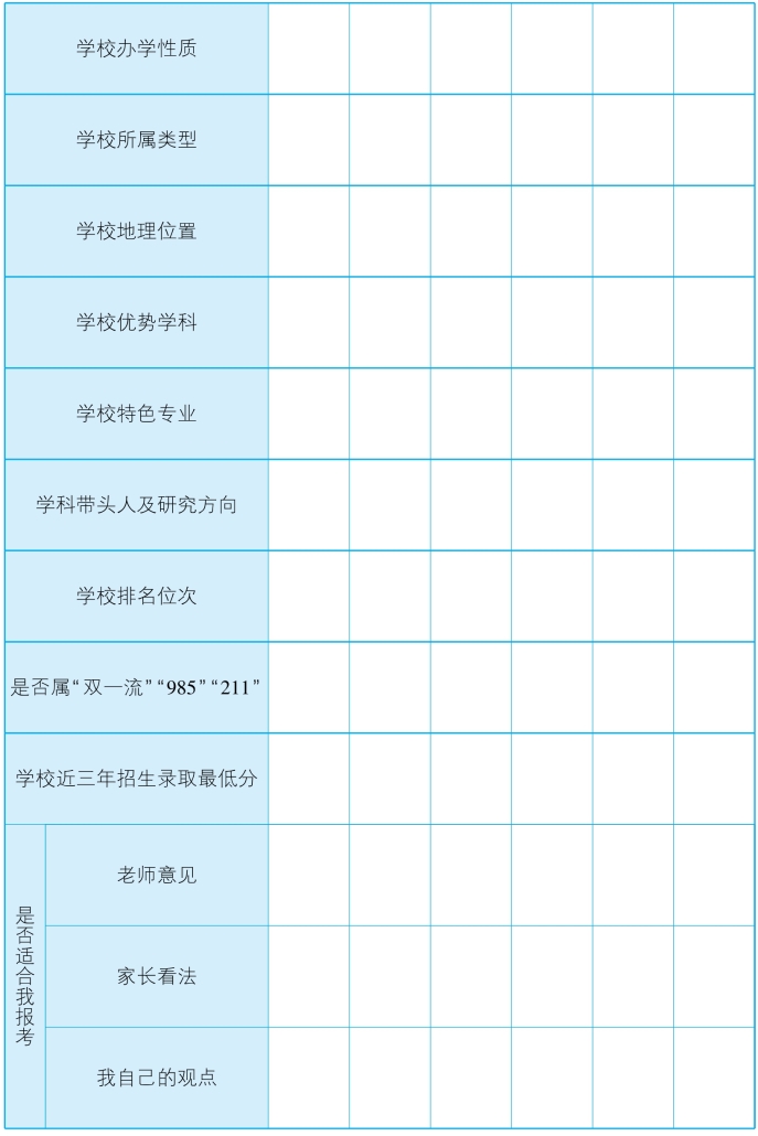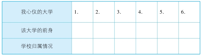 请你按先后顺序写出自己心目中向往的6所大学,并通过不同途径对这些大学的特点及办学基本情况进行全面了解,在此基础上完成下表。