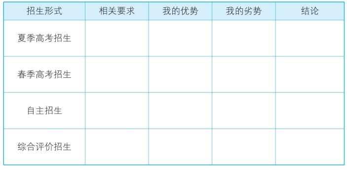 2.请了解本科招生的各种形式,并根据自身实际情况进行分析,最适合自己的升学路径是什么?请将你的自我分析要点填写在下列表格内。
