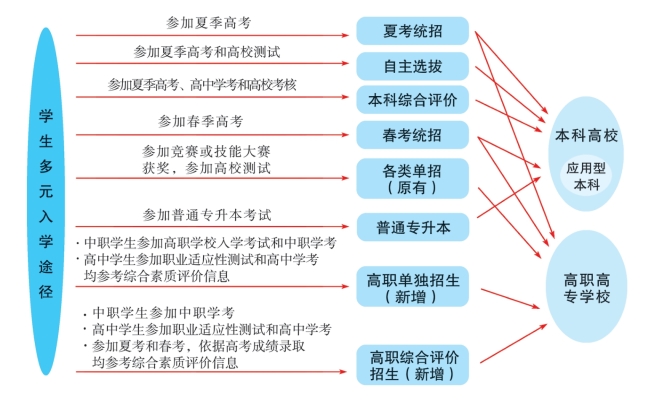 自2020年起,面向普通高中学生开展综合评价招生,实施范围为学校定位明确、招生管理规范、行业特色鲜明且社会急需的省内高职(专科)院校和本科高校的专科专业。考生需参加招生院校组织的职业适应性测试。招生院校依据考生的普通高中学业水平合格考试成绩和职业适应性测试结果,参考学生综合素质评价择优录取。