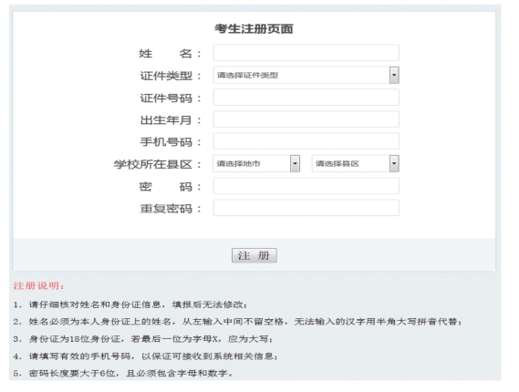 然后,点击“注册”按钮(上图红框内),进入考生注册页面(如下图所示):