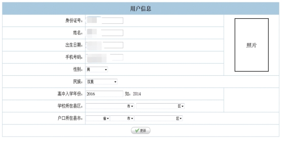 (2)登录。在系统登录页面,输入注册证件号、密码和验证码,点击“登录”按钮,进入系统。需要注意的是:注册后首次进入系统,需要完善用户基本信息(如下图所示)。将基本信息完善后,点击“更新”按钮。更新成功,系统会跳转至主页面。