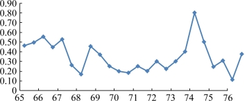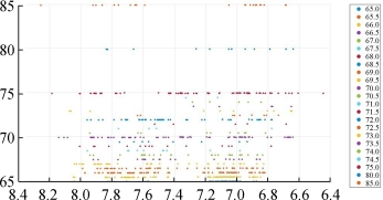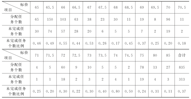 从图3中显示的数据来看,由于未完成任务的比例随任务标价有明显波动,因此定价区间较小。我们暂可定性地认为,定价较低的区间(65—67)内任务完成情况较差,而相对来说,中等价位(67.5—73)和高等价位(75—85)定价的任务完成情况较好,符合会员优先选择高定价任务的一般心理。而在后端位置(74—74.5)未完成情况突然出现极峰,这与上述总结规律相悖,查找数据我们发现该区间内样本数(s=7)较少,这种情况的发生,很可能是由于其他外部因素的干扰而引起的,需要进一步的处理研究。