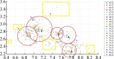 从图4中我们可以观察到,任务的定价与任务的地理位置分布有关,定价的价格往往以某个圆的圆心为中心,随着半径的增大定价的价格越来越高。查找图中五个圆心的经纬度可以发现,该五个圆的圆心分别对应着一座城市的市中心。