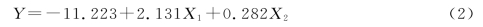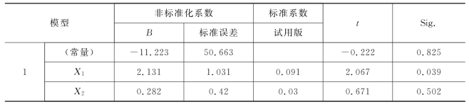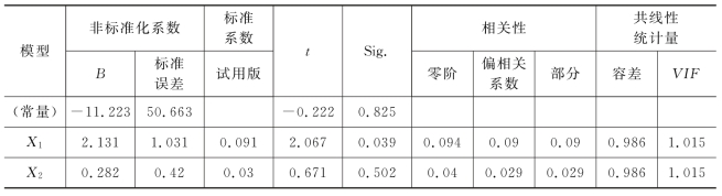 从表2可知,解释变量X1、X2二者的方差膨胀因子VIF均为1.015,其值小于10,而二者的容忍度均大于0.1。所以,可以判断解释变量X1、X2二者之间不存在多重共线性,满足多元线性回归要求。