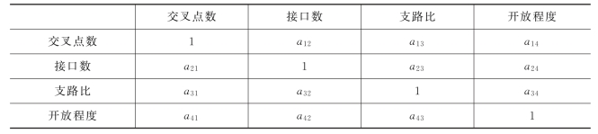 最后通过建立线性相关性模型得出小区开放程度同交叉点数、接口数、支路比之间的线性评估函数为: