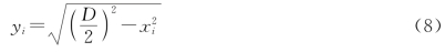 沿方向将直径RR'均分成20份,记每份的中点的横坐标为xi(i=1,2,3,…,20);过点(xi,0)作y轴的平行线,交圆O于点(xi,yi),开槽设计图如图6所示。
