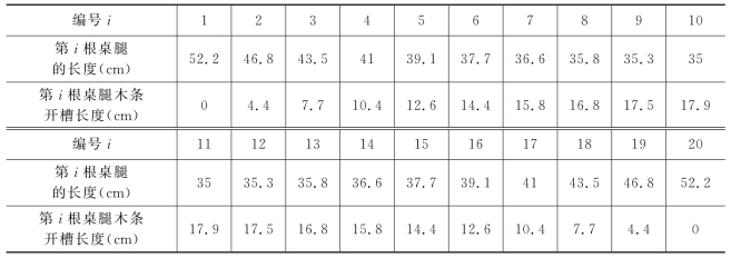 把参数分别代入式(9)、(12),可以得到所有的桌腿长和槽长,表1中给出了折叠桌一侧第1根到第20根的桌腿长度和开槽长度。