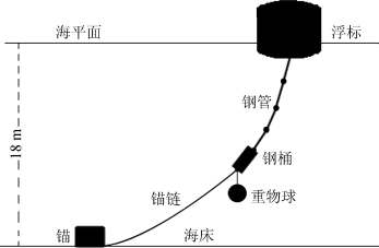 浮标系统、系泊系统和水声通信系统组成近浅海观测网的传输节点(如图1所示)。某型传输节点的浮标系统可简化为底面直径为2m、高2m的质量为1000kg的圆柱。系泊系统由钢管、钢桶、重物球、电焊锚链和特制的抗拖移锚组成。其中,锚的质量为600kg,锚链为普通无挡链环,近浅海观测网的锚链常用型号及其参数在附表中列出。钢管共有4节,每节长度为1m,直径为50mm,每节钢管的质量为10kg。要求锚链与锚的链接处的切线方向与海床的夹角不超过16°,否则锚会被拖行,致使节点移位丢失。在一个长1m、外径30cm的密封圆柱形钢桶内安装有水声通信系统,设备和钢桶总质量为100kg。钢桶上接第4节钢管,下接电焊锚链。钢桶竖直时,水声通信设备的工作效果最佳。若钢桶倾斜,则影响设备的工作效果。钢桶与竖直方向的夹角一般超过5°时,设备的工作效果较差。为了控制桶的倾斜角度,可在桶与锚链的链接处悬挂适当的重物球。