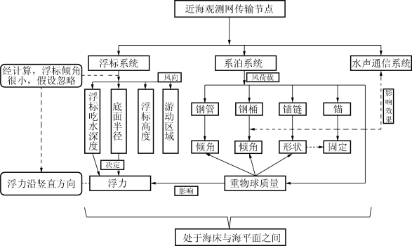 根据传输节点示意图,水面下物体的姿态取决于水面浮标的状态,在海水静止的条件下,浮标主要受到海平面风力F、海水浮力Ffb、重力G与钢管拉力T的作用,系统达到平衡状态的条件如下: