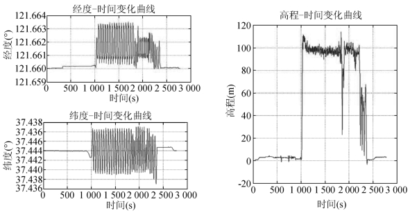 这样就保证在时间轴上,所有参数能够统一,可共用同一时间轴。根据所给数据,调用MATLAB画图工具,可以得到经度、纬度、高程关于时间的变化曲线,如图8所示。