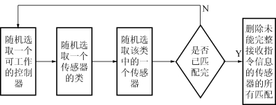 对于问题(1)中的一对一匹配,我们首先在控制器集合中随机选取未匹配的传感器,选取传感器时要分两步,先在控制器的类集合中随机选取一个类,再在该类中随机选取一个可匹配的传感器进行匹配,直到控制器集合和传感器集合中不再有可匹配的对象。在算出初解后将不能够完整接收指令信息的传感器的所有匹配删除,实现控制器的高效,流程如图5所示: